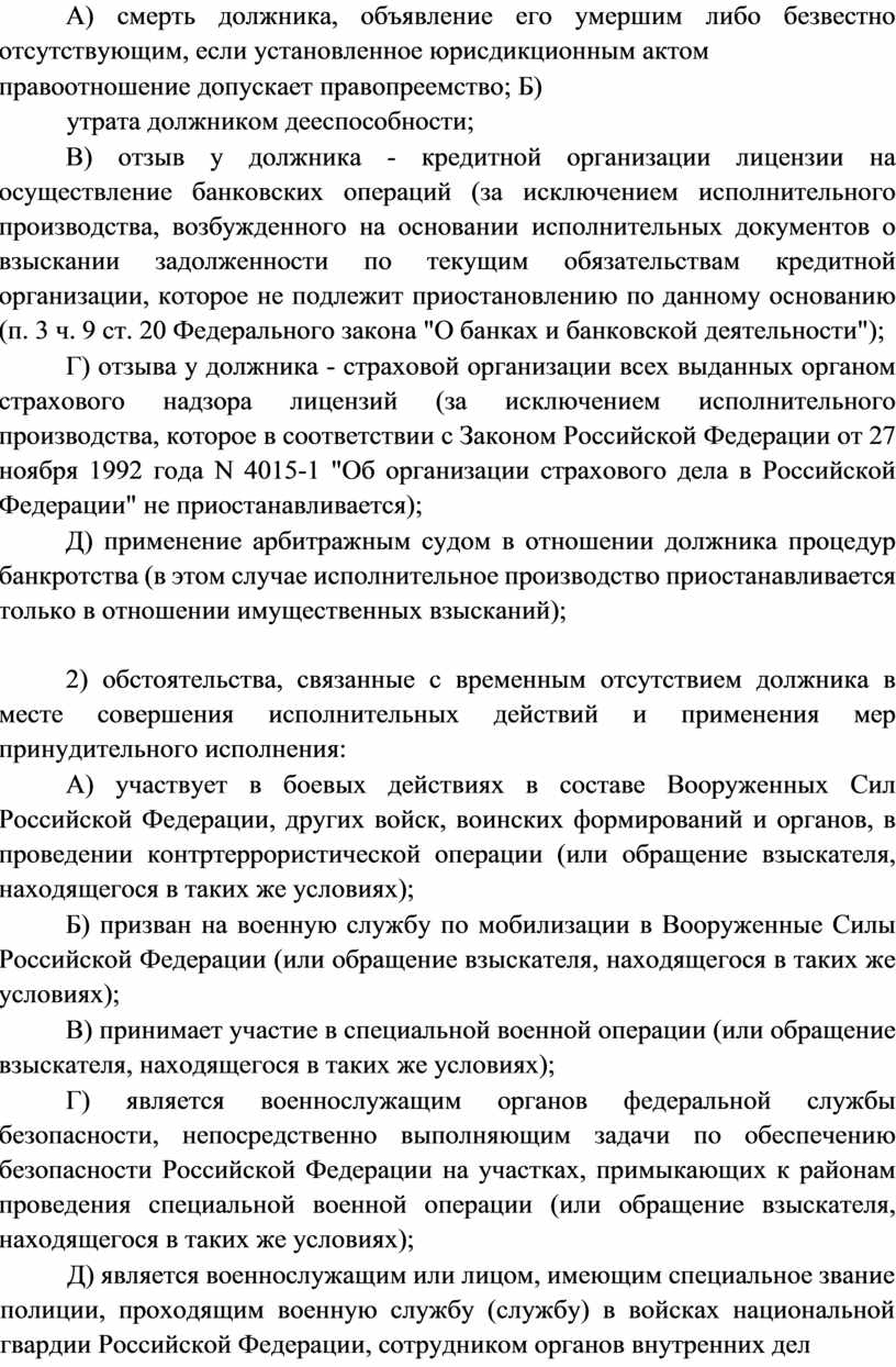 Г) прекращения обязательств должника по основаниям, предусмотренным частями 1 и 2 статьи 2, статьей 2.1 Федерального закона от 7 октября 2022 года N 377-ФЗ "Об особенностях исполнения обязательств по кредитным договорам (договорам займа) лицами, призванными на военную службу по мобилизации в Вооруженные Силы Российской Федерации, лицами, принимающими участие в специальной военной операции, а также членами их семей и о внесении изменений в отдельные законодательные акты Российской Федерации".