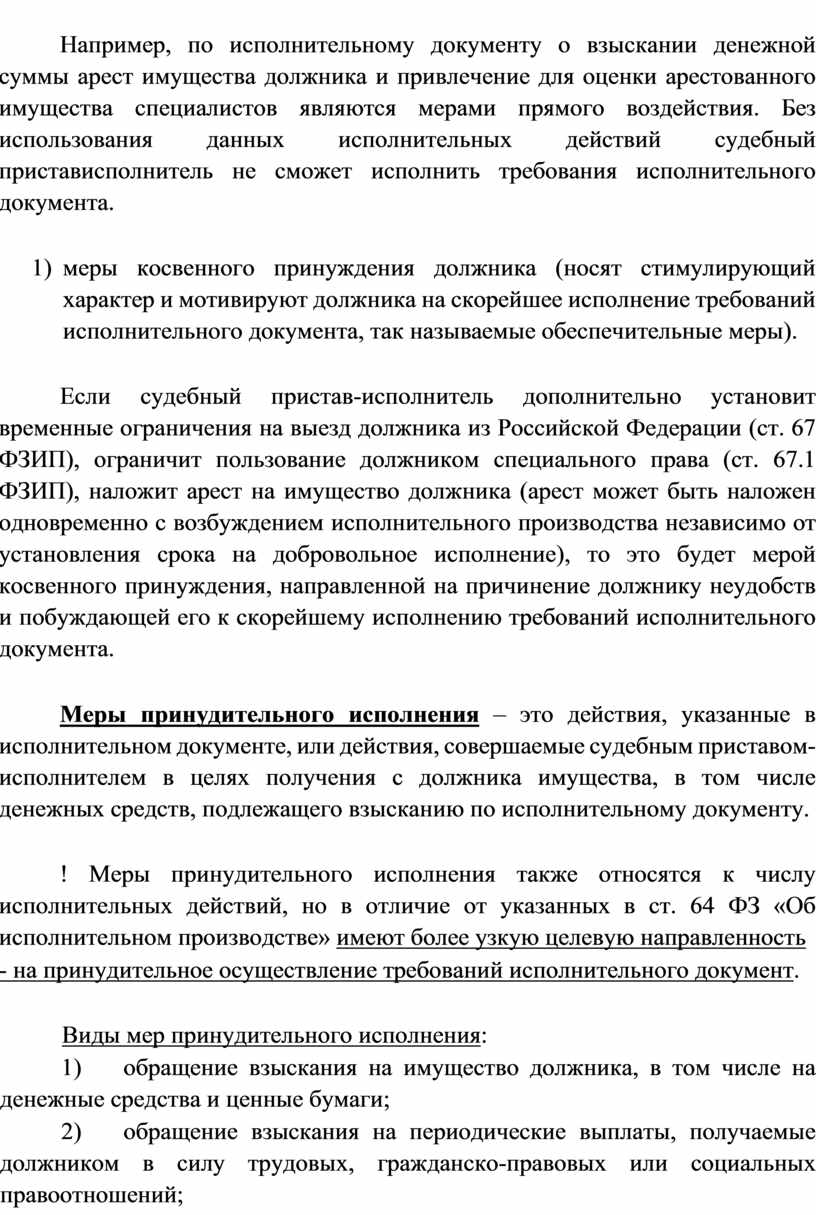 Например, по исполнительному документу о взыскании денежной суммы арест имущества должника и привлечение для оценки арестованного имущества специалистов являются мерами прямого воздействия. Без использования данных исполнительных действий судебный пристависполнитель не сможет исполнить требования исполнительного документа.