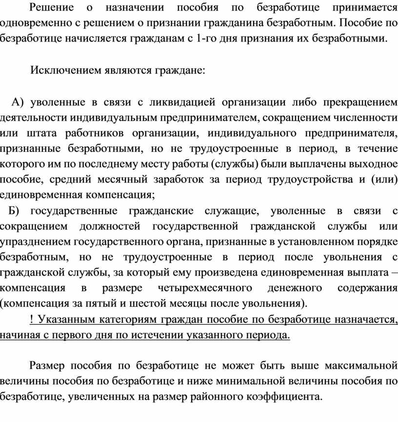 ! Указанным категориям граждан пособие по безработице назначается, начиная с первого дня по истечении указанного периода.