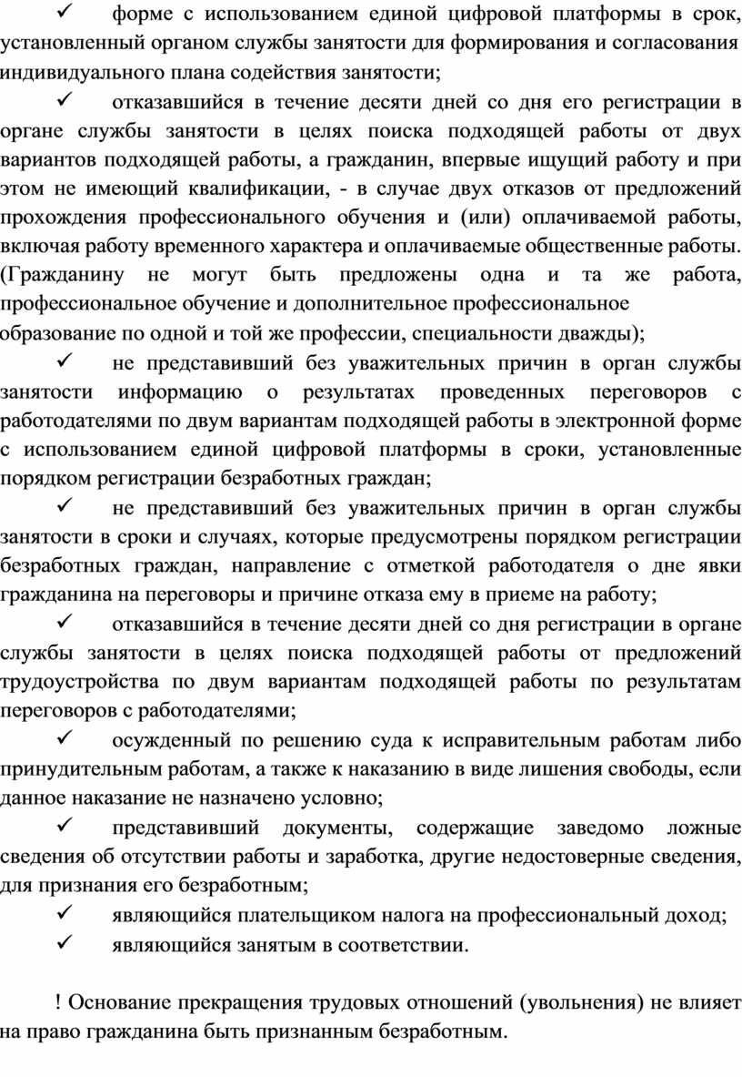 ü не представивший без уважительных причин в орган службы занятости информацию о результатах проведенных переговоров с работодателями по двум вариантам подходящей работы в электронной форме с использованием единой цифровой платформы в сроки, установленные порядком регистрации безработных граждан;