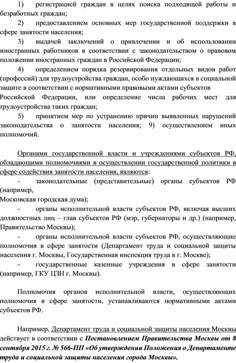 - органы исполнительной власти субъектов РФ, осуществляющие полномочия в сфере занятости (Департамент труда и социальной защиты населения г. Москвы, Государственная инспекция труда в г. Москве);