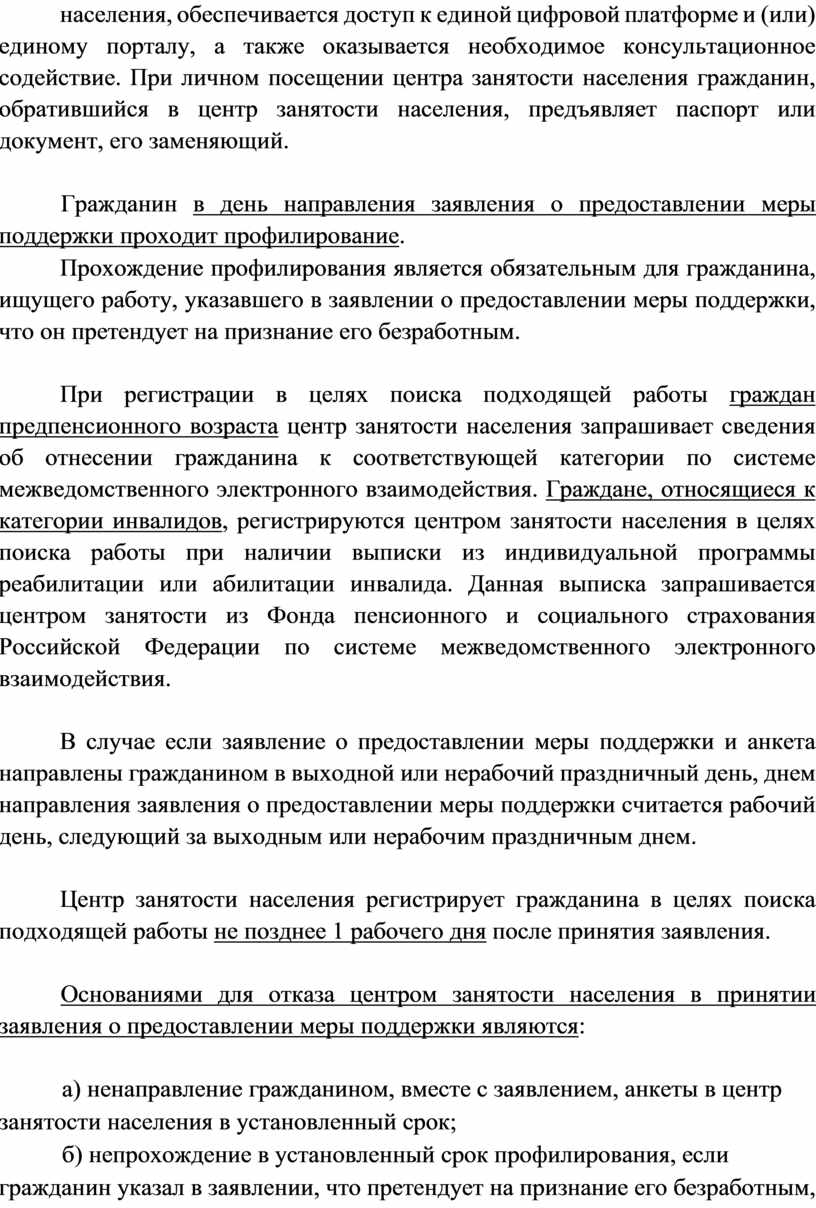 В этом случае центр занятости населения оказывает гражданину содействие в подаче заявления о предоставлении меры поддержки и составлении анкеты. Гражданину, обратившемуся в центр занятости населения, обеспечивается доступ к единой цифровой платформе и (или) единому порталу, а также оказывается необходимое консультационное содействие. При личном посещении центра занятости населения гражданин, обратившийся в центр занятости населения, предъявляет паспорт или документ, его заменяющий.