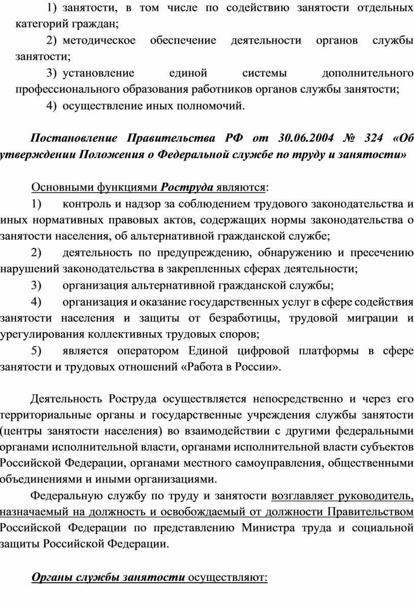 Постановление Правительства РФ от 30.06.2004 № 324 «Об утверждении Положения о Федеральной службе по труду и занятости»