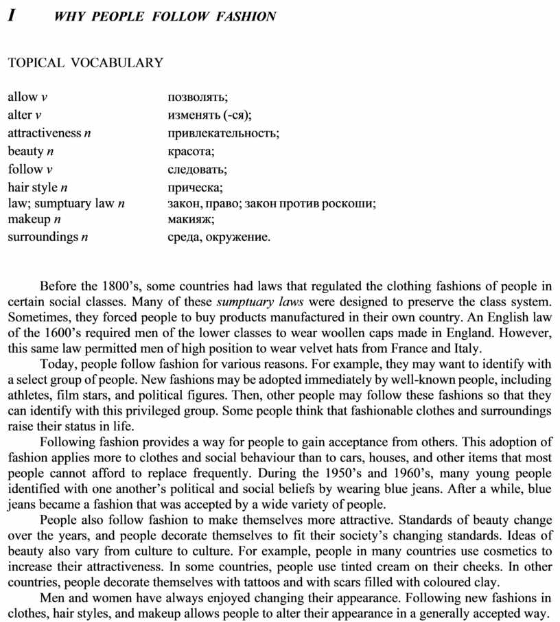 Today, people follow fashion for various reasons. For example, they may want to identify with a select group of people. New fashions may be adopted immediately by well-known people, including athletes, film stars, and political figures. Then, other people may follow these fashions so that they can identify with this privileged group. Some people think that fashionable clothes and surroundings raise their status in life.