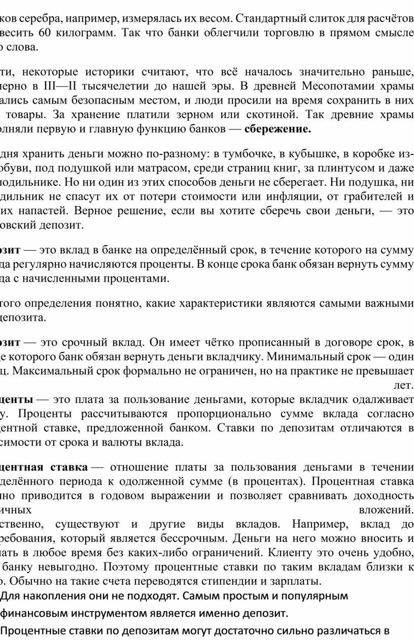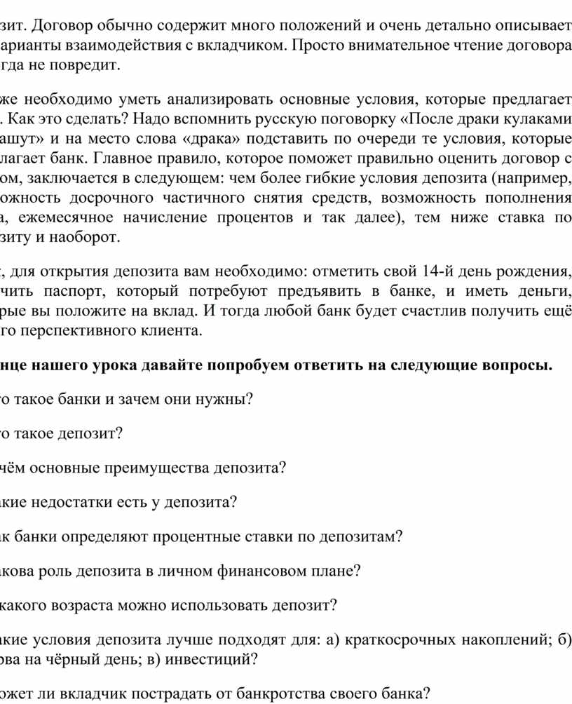 Депозит — это вклад в банке на определённый срок, в течение которого на сумму вклада регулярно начисляются проценты. В конце срока банк обязан вернуть сумму вклада с начисленными процентами.