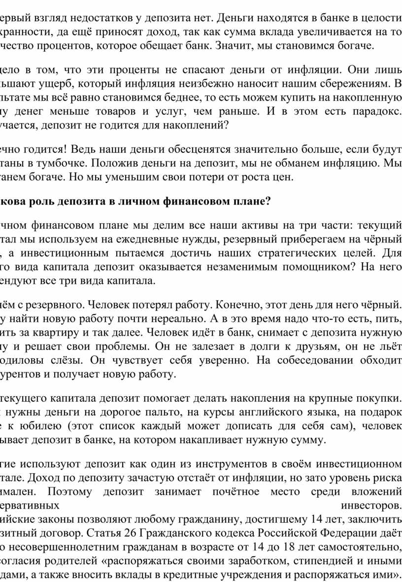 На первый взгляд недостатков у депозита нет. Деньги находятся в банке в целости и сохранности, да ещё приносят доход, так как сумма вклада увеличивается на то количество процентов, которое обещает банк. Значит, мы становимся богаче.