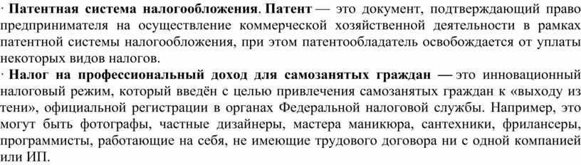 · Патентная система налогообложения. Патент — это документ, подтверждающий право предпринимателя на осуществление коммерческой хозяйственной деятельности в рамках патентной системы налогообложения, при этом патентообладатель освобождается от уплаты некоторых видов налогов.
