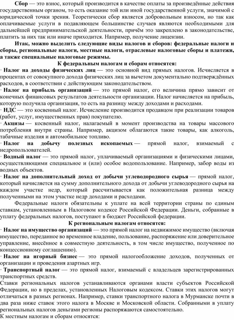 · Единый налог на вменённый доход для отдельных видов деятельности — представляет собой систему налогообложения определённых видов деятельности, при которой сумма налога рассчитывается не с фактически полученной прибыли, а с вменённого дохода, то есть с дохода, который только предполагается получить.
