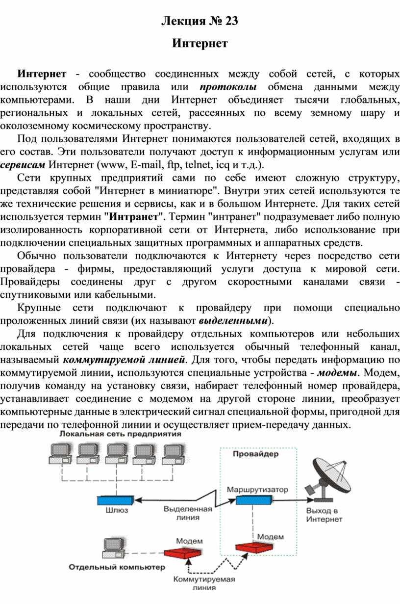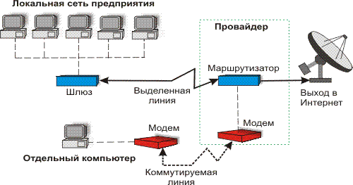 Обычно пользователи подключаются к Интернету через посредство сети провайдера - фирмы, предоставляющий услуги доступа к мировой сети. Провайдеры соединены друг с другом скоростными каналами связи - спутниковыми или кабельными.