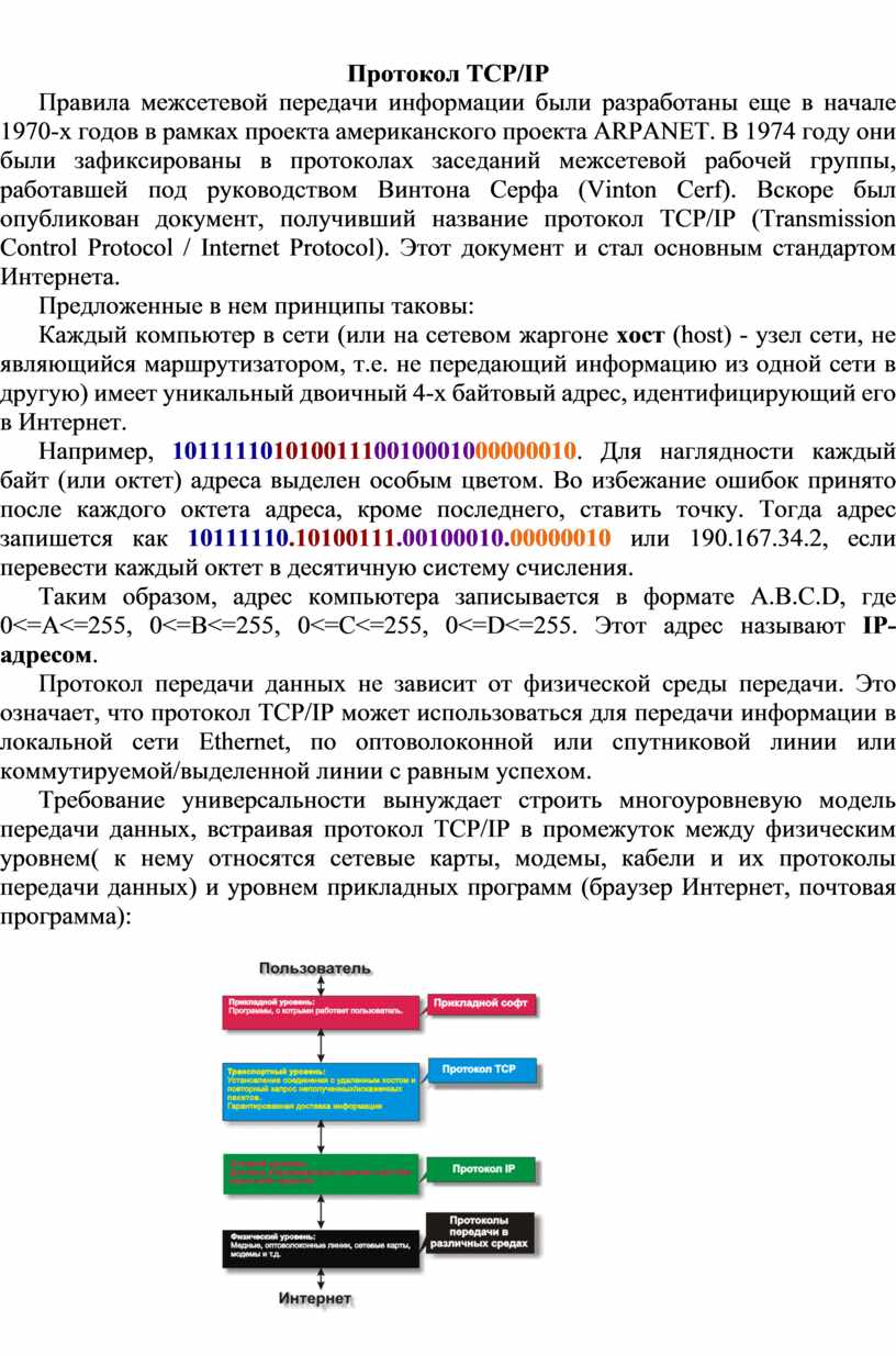 Правила межсетевой передачи информации были разработаны еще в начале 1970-х годов в рамках проекта американского проекта ARPANET. В 1974 году они были зафиксированы в протоколах заседаний межсетевой рабочей группы, работавшей под руководством Винтона Серфа (Vinton Cerf). Вскоре был опубликован документ, получивший название протокол TCP/IP (Transmission Control Protocol / Internet Protocol). Этот документ и стал основным стандартом Интернета.
