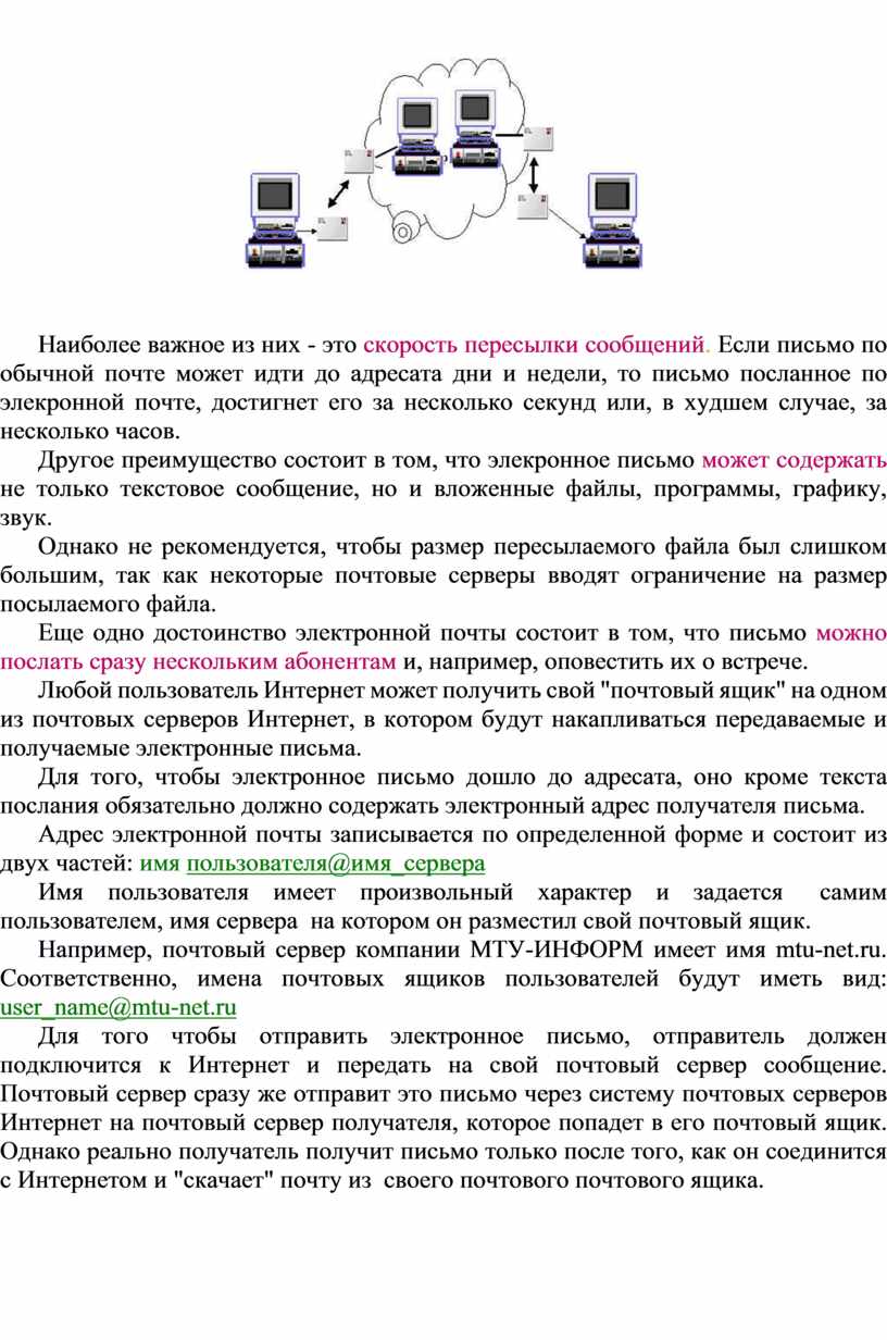 Наиболее важное из них - это скорость пересылки сообщений. Если письмо по обычной почте может идти до адресата дни и недели, то письмо посланное по элекронной почте, достигнет его за несколько секунд или, в худшем случае, за несколько часов.