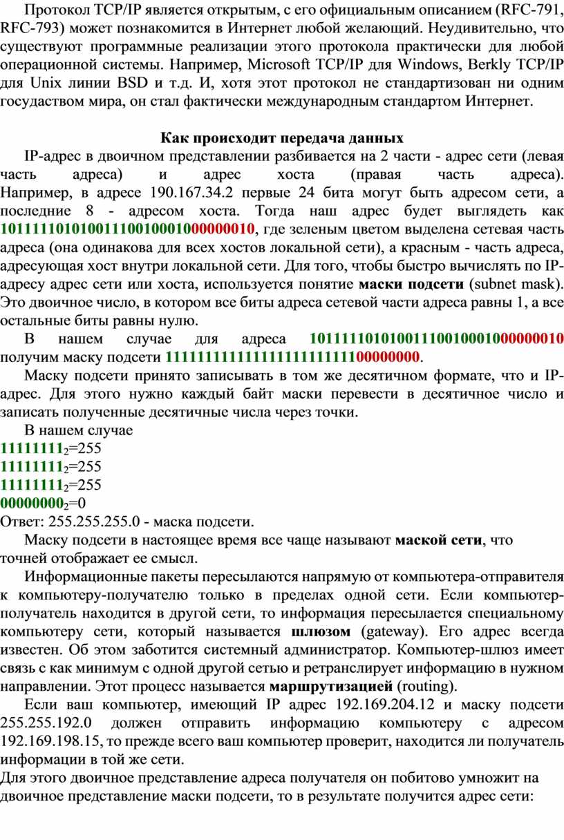 Адрес сети получателя совпадает с адресом собственной сети. Следовательно, получатель находится в локальной сети, и информация может быть послана напрямую. Если бы совпадения не произошло, то информация была бы отправлена шлюзу (с адресом, например,192.168.192.2) с указанием адреса получателя 192.169.204.15, а он переслал бы ее в другую сеть. Этот процесс продолжался бы до тех пор, пока информация не дошла бы до получателя.