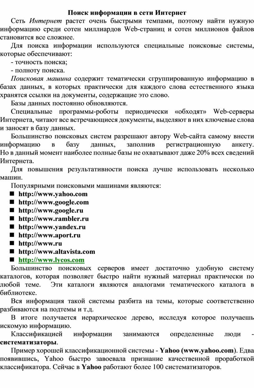 Для поиска информации используются специальные поисковые системы, которые обеспечивают: