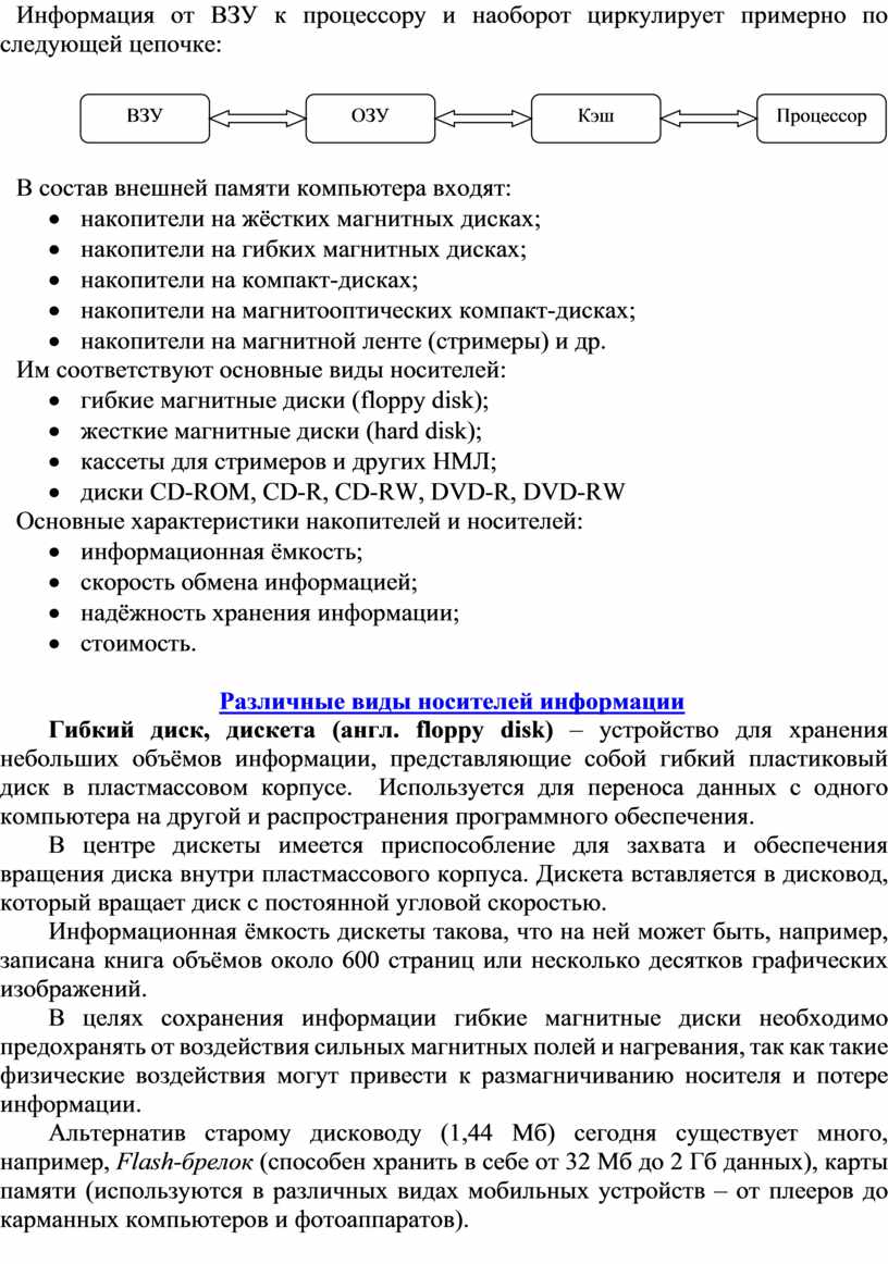 Внешняя память (ВЗУ) предназначена для длительного хранения программ и данных, и целостность её содержимого не зависит от того, включён или выключен компьютер. В отличие от оперативной памяти, внешняя память не имеет прямой связи с процессором. Устройство, которое обеспечивает запись / считывание информации, называется накопителем или дисководом, а хранится информация на носителях (например, на дискетах).