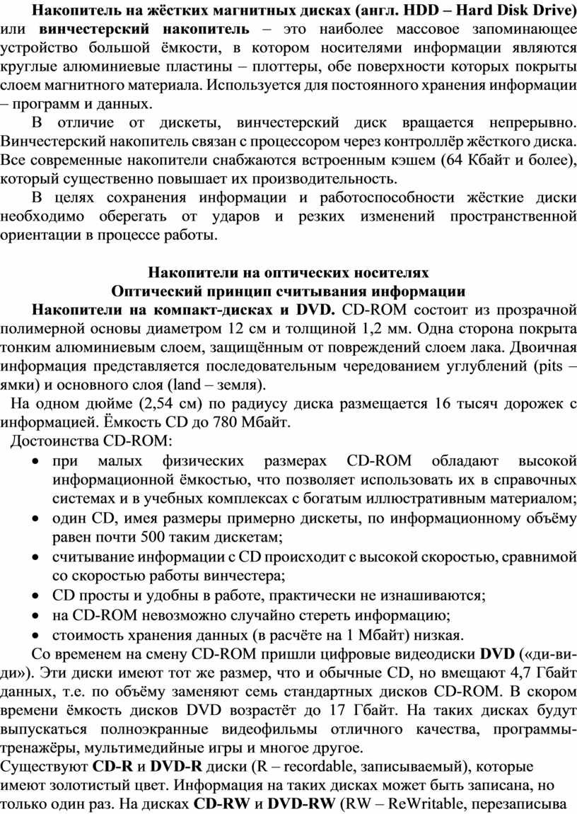 Накопитель на жёстких магнитных дисках (англ. HDD – Hard Disk Drive) или винчестерский накопитель – это наиболее массовое запоминающее устройство большой ёмкости, в котором носителями информации являются круглые алюминиевые пластины – плоттеры, обе поверхности которых покрыты слоем магнитного материала. Используется для постоянного хранения информации – программ и данных.