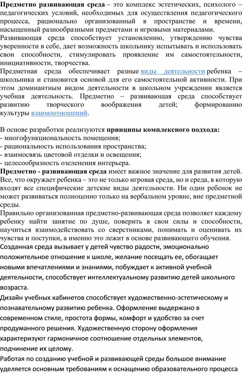 Предметно - развивающая среда имеет важное значение для развития детей. Все, что окружает ребенка – это не только игровая среда, но и среда, в которую входят все специфические детские виды деятельности. Ни один ребенок не может развиваться полноценно только на вербальном уровне, вне предметной среды.