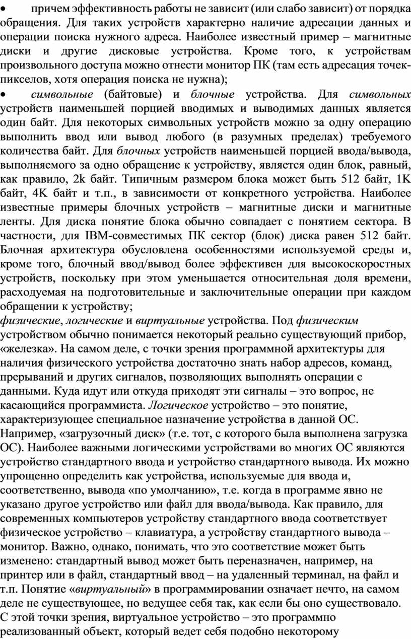 · физические, логические и виртуальные устройства. Под физическим устройством обычно понимается некоторый реально существующий прибор, «железка». На самом деле, с точки зрения программной архитектуры для наличия физического устройства достаточно знать набор адресов, команд, прерываний и других сигналов, позволяющих выполнять операции с данными. Куда идут или откуда приходят эти сигналы – это вопрос, не касающийся программиста. Логическое устройство – это понятие, характеризующее специальное назначение устройства в данной ОС. Например, «загрузочный диск» (т.е. тот, с которого была выполнена загрузка ОС). Наиболее важными логическими устройствами во многих ОС являются устройство стандартного ввода и устройство стандартного вывода. Их можно упрощенно определить как устройства, используемые для ввода и, соответственно, вывода «по умолчанию», т.е. когда в программе явно не указано другое устройство или файл для ввода/вывода. Как правило, для современных компьютеров устройству стандартного ввода соответствует физическое устройство – клавиатура, а устройству стандартного вывода – монитор. Важно, однако, понимать, что это соответствие может быть изменено: стандартный вывод может быть переназначен, например, на принтер или в файл, стандартный ввод – на удаленный терминал, на файл и т.п. Понятие «виртуальный» в программировании означает нечто, на самом деле не существующее, но ведущее себя так, как если бы оно существовало. С этой точки зрения, виртуальное устройство – это программно реализованный объект, который ведет себя подобно некоторому физическому устройству, хотя на самом деле использует ресурсы совсем других устройств (или даже никаких устройств). Примеры виртуальных устройств весьма разнообразны: