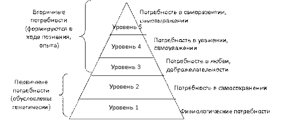 Эти потребности образуют иерархическую структуру, которая определяет поведение человека, причем потребности высшего уровня не мотивируют человека, пока хотя бы частично не удовлетворены потребности нижнего уровня.