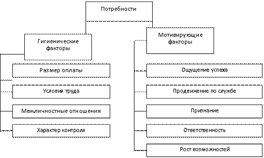 § потребности делятся на гигиенические (размер оплаты, условия труда, межличностные отношения, характер контроля) и мотивирующие факторы (ощущение успеха, продвижение по службе, признание, ответственность, рост возможностей);