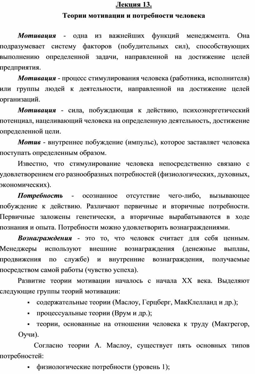 § содержательные теории (Маслоу, Герцберг, МакКлелланд и др.);