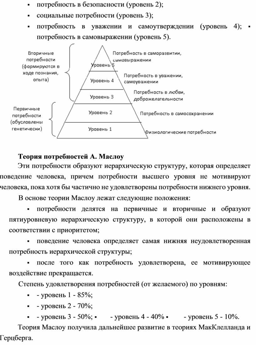 § потребности делятся на первичные и вторичные и образуют пятиуровневую иерархическую структуру, в которой они расположены в соответствии с приоритетом;