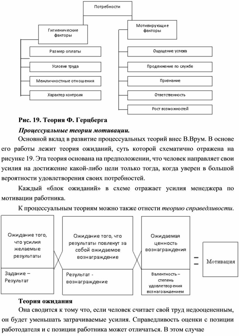 Основной вклад в развитие процессуальных теорий внес В.Врум. В основе его работы лежит теория ожиданий, суть которой схематично отражена на рисунке 19. Эта теория основана на предположении, что человек направляет свои усилия на достижение какой-либо цели только тогда, когда уверен в большой вероятности удовлетворения своих потребностей.