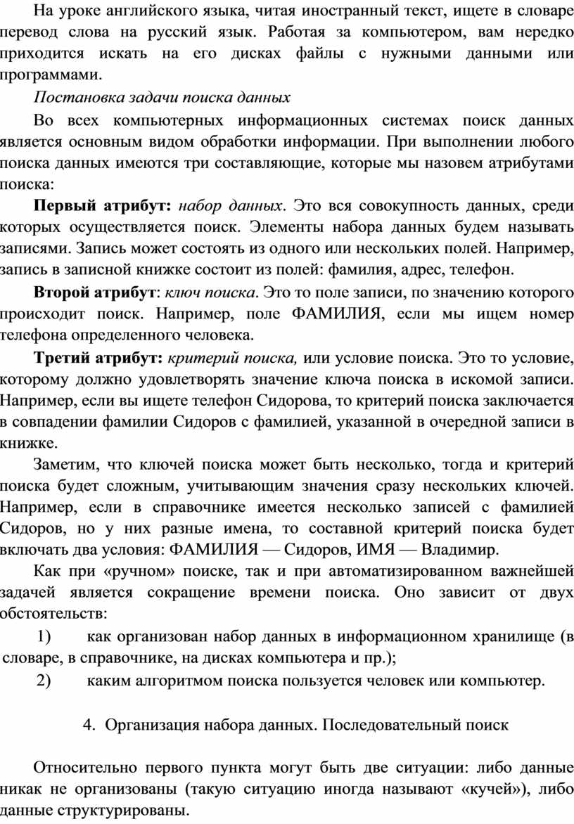 Вспомните, как часто приходится вам искать какие-нибудь данные. Таких примеров много и в бытовых ситуациях, и в учебном процессе. Например, в программе телепередач вы ищете время начала трансляции футбольного матча; в расписании поездов — сведения о поезде, идущем до нужной вам станции. На уроке физики, решая задачу, ищете в таблице удельный вес меди. На уроке английского языка, читая иностранный текст, ищете в словаре перевод слова на русский язык. Работая за компьютером, вам нередко приходится искать на его дисках файлы с нужными данными или программами.