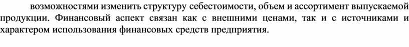 Среди факторов, влияющих на прибыль, достаточно очевидно проявляется наличие как производственной, так и финансовой составляющих. Производственный аспект связан с возможностями изменить структуру себестоимости, объем и ассортимент выпускаемой продукции. Финансовый аспект связан как с внешними ценами, так и с источниками и характером использования финансовых средств предприятия.