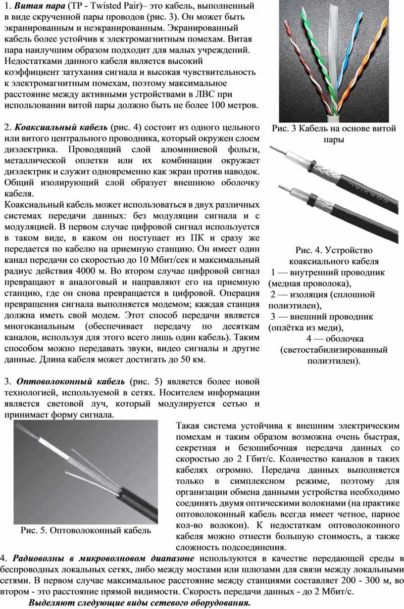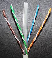 1. Витая пара (TP - Twisted Pair)– это кабель, выполненный в виде скрученной пары проводов (рис. 3). Он может быть экранированным и неэкранированным. Экранированный кабель более устойчив к электромагнитным помехам. Витая пара наилучшим образом подходит для малых учреждений. Недостатками данного кабеля является высокий коэффициент затухания сигнала и высокая чувствительность к электромагнитным помехам, поэтому максимальное расстояние между активными устройствами в ЛВС при использовании витой пары должно быть не более 100 метров.