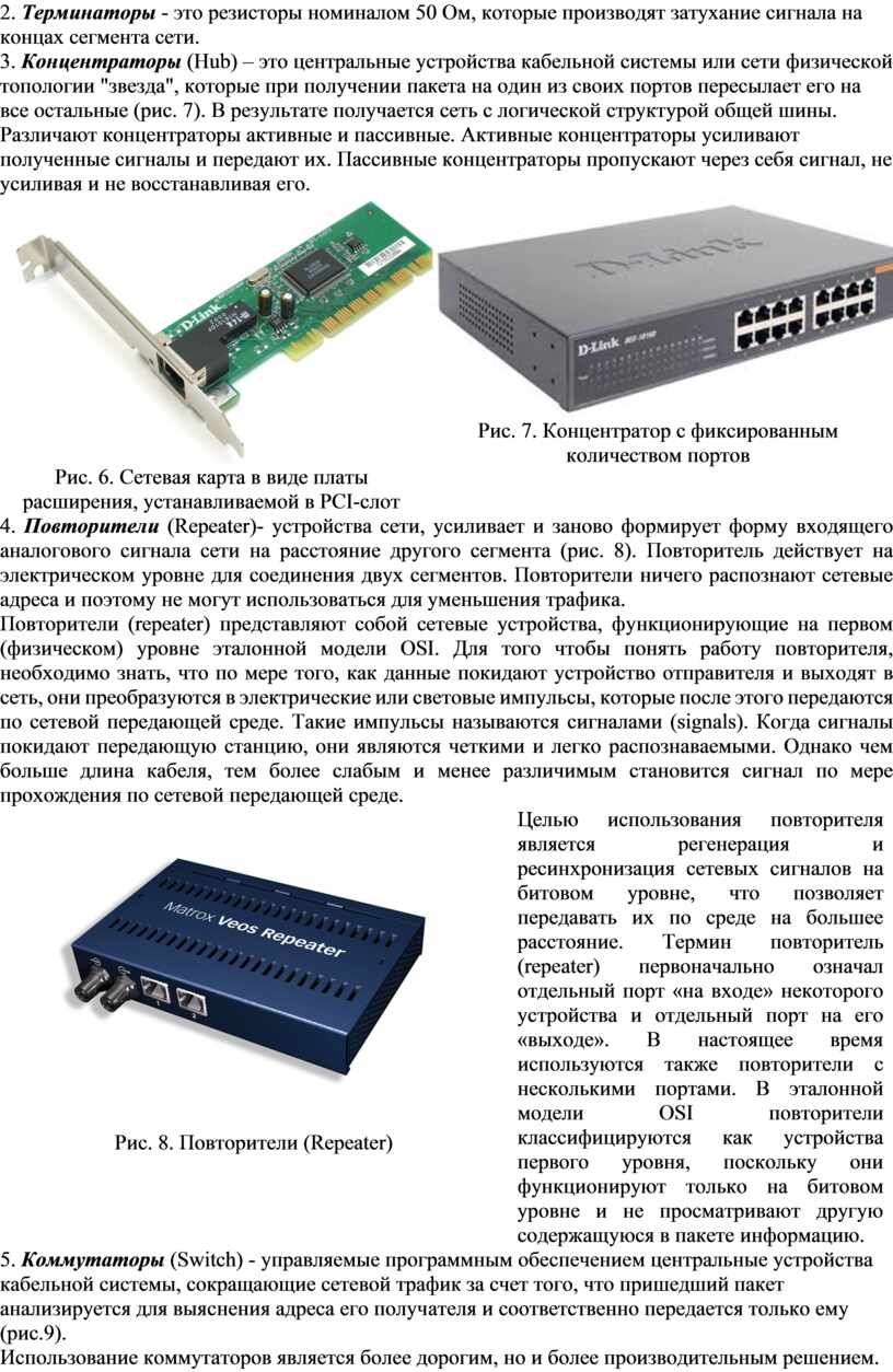 4. Повторители (Repeater)- устройства сети, усиливает и заново формирует форму входящего аналогового сигнала сети на расстояние другого сегмента (рис. 8). Повторитель действует на электрическом уровне для соединения двух сегментов. Повторители ничего распознают сетевые адреса и поэтому не могут использоваться для уменьшения трафика.