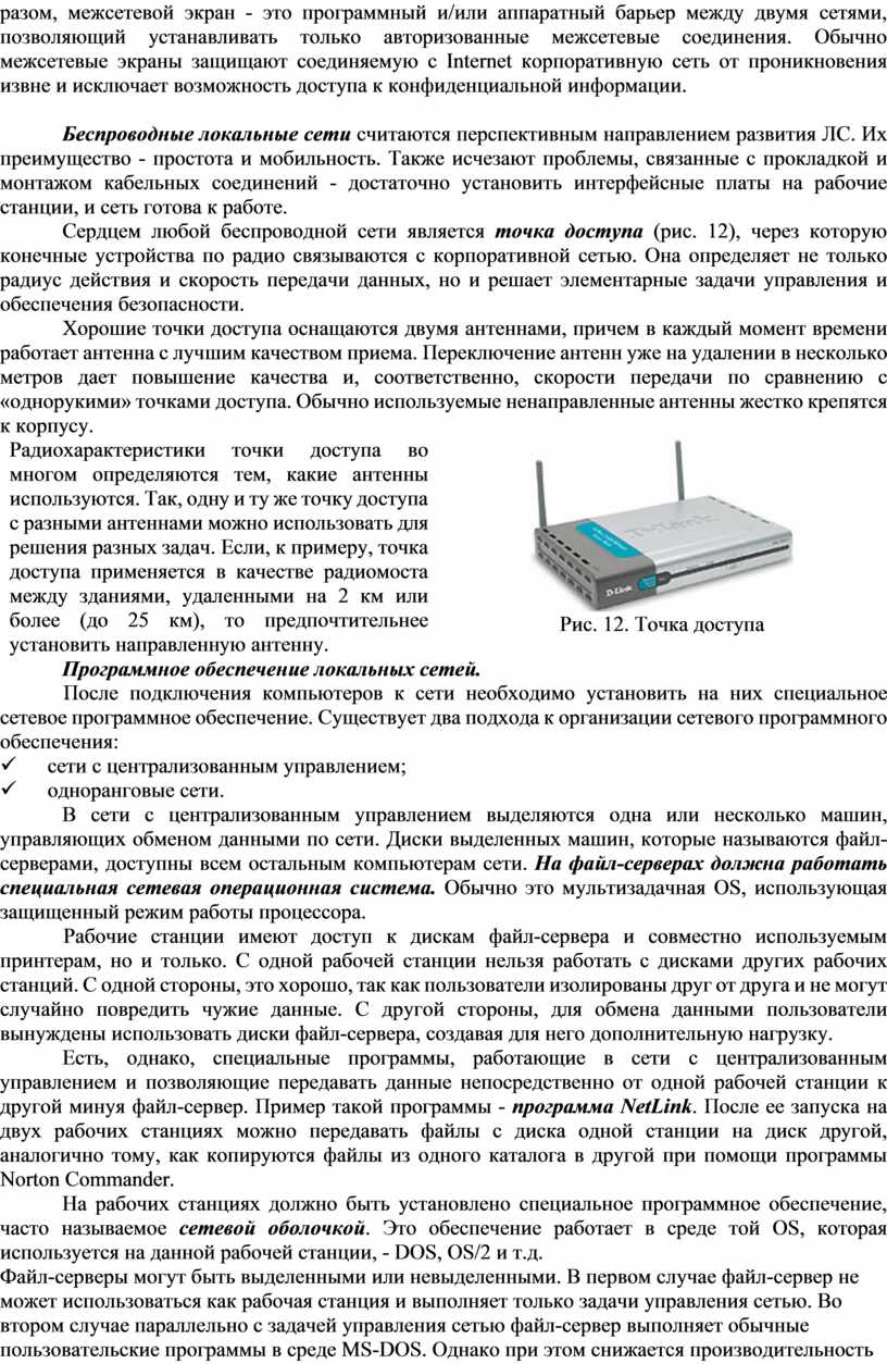 Например, все участники локальной сети могут совместно использовать одно общее устройство печати - сетевой принтер или, например, ресурсы жестких дисков одного выделенного компьютера - файлового сервера. Аналогично можно совместно использовать и программное обеспечение. Если в сети имеется специальный компьютер, выделенный для совместного использования участниками сети, он называется файловым сервером. Основными компонентами сети являются рабочие станции, серверы, передающие среды (кабели) и сетевое оборудование.