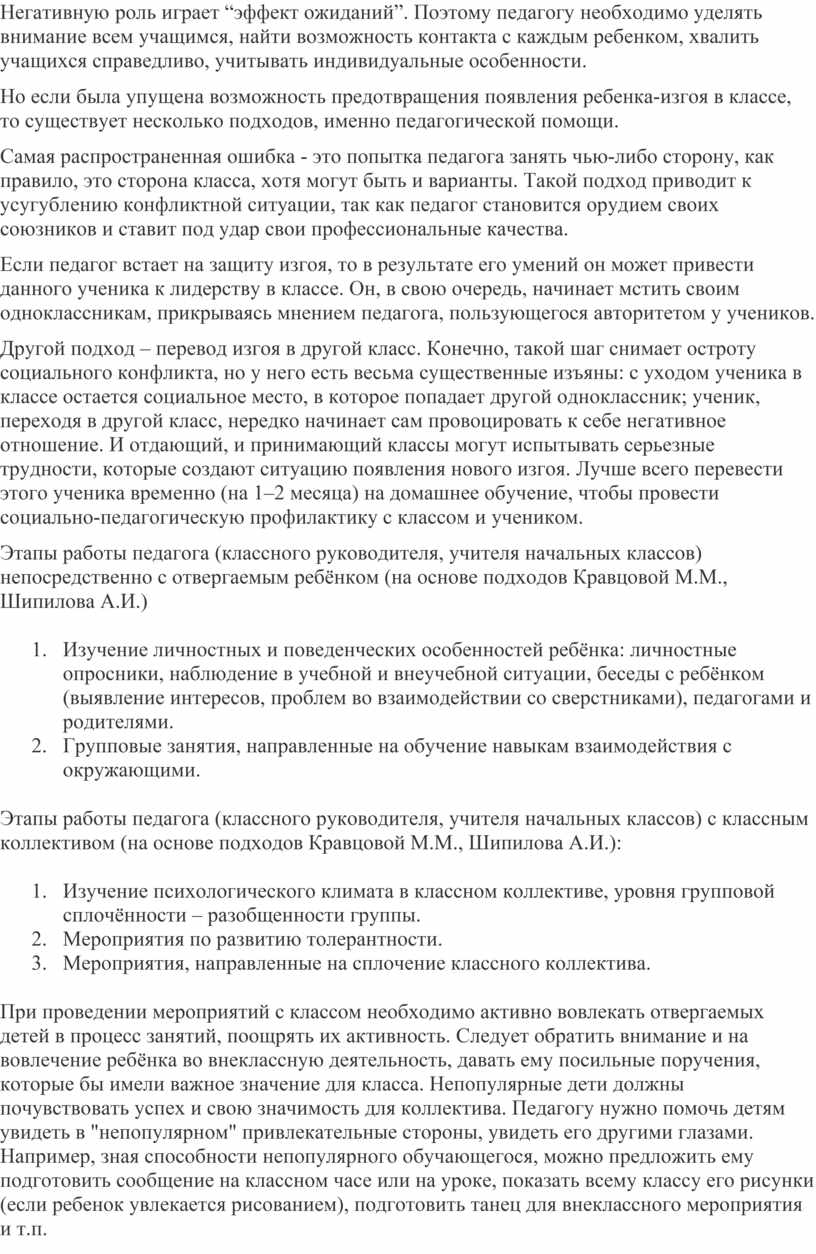Этапы работы педагога (классного руководителя, учителя начальных классов) непосредственно с отвергаемым ребёнком (на основе подходов Кравцовой М.М., Шипилова А.И.)