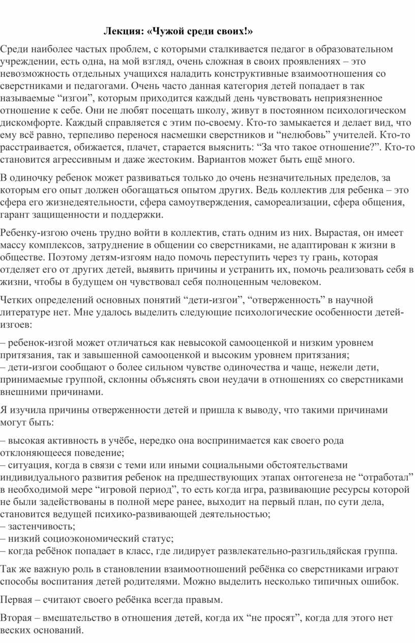 Среди наиболее частых проблем, с которыми сталкивается педагог в образовательном учреждении, есть одна, на мой взгляд, очень сложная в своих проявлениях – это невозможность отдельных учащихся наладить конструктивные взаимоотношения со сверстниками и педагогами. Очень часто данная категория детей попадает в так называемые “изгои”, которым приходится каждый день чувствовать неприязненное отношение к себе. Они не любят посещать школу, живут в постоянном психологическом дискомфорте. Каждый справляется с этим по-своему. Кто-то замыкается и делает вид, что ему всё равно, терпеливо перенося насмешки сверстников и “нелюбовь” учителей. Кто-то расстраивается, обижается, плачет, старается выяснить: “За что такое отношение?”. Кто-то становится агрессивным и даже жестоким. Вариантов может быть ещё много.