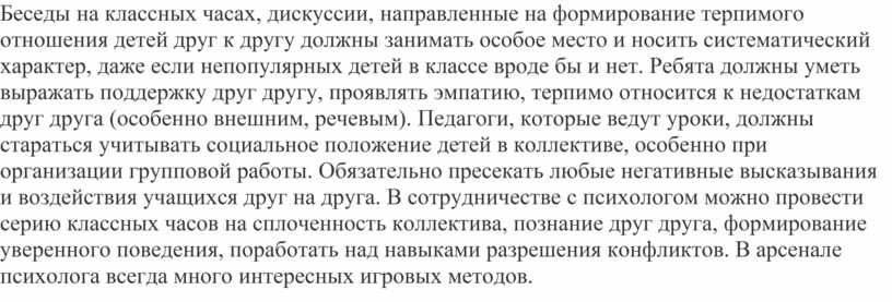 Беседы на классных часах, дискуссии, направленные на формирование терпимого отношения детей друг к другу должны занимать особое место и носить систематический характер, даже если непопулярных детей в классе вроде бы и нет. Ребята должны уметь выражать поддержку друг другу, проявлять эмпатию, терпимо относится к недостаткам друг друга (особенно внешним, речевым). Педагоги, которые ведут уроки, должны стараться учитывать социальное положение детей в коллективе, особенно при организации групповой работы. Обязательно пресекать любые негативные высказывания и воздействия учащихся друг на друга. В сотрудничестве с психологом можно провести серию классных часов на сплоченность коллектива, познание друг друга, формирование уверенного поведения, поработать над навыками разрешения конфликтов. В арсенале психолога всегда много интересных игровых методов.