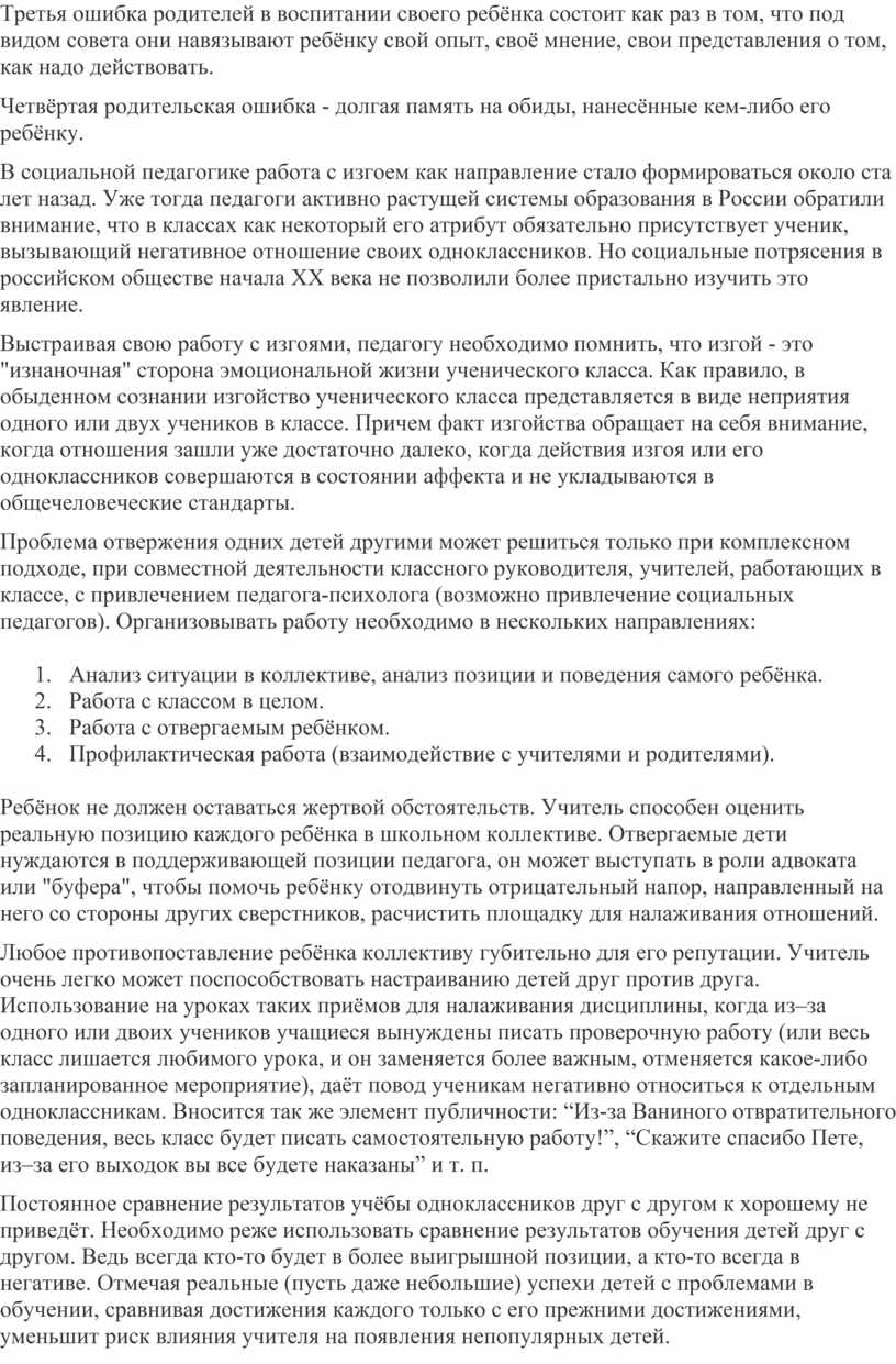 Выстраивая свою работу с изгоями, педагогу необходимо помнить, что изгой - это "изнаночная" сторона эмоциональной жизни ученического класса. Как правило, в обыденном сознании изгойство ученического класса представляется в виде неприятия одного или двух учеников в классе. Причем факт изгойства обращает на себя внимание, когда отношения зашли уже достаточно далеко, когда действия изгоя или его одноклассников совершаются в состоянии аффекта и не укладываются в общечеловеческие стандарты.
