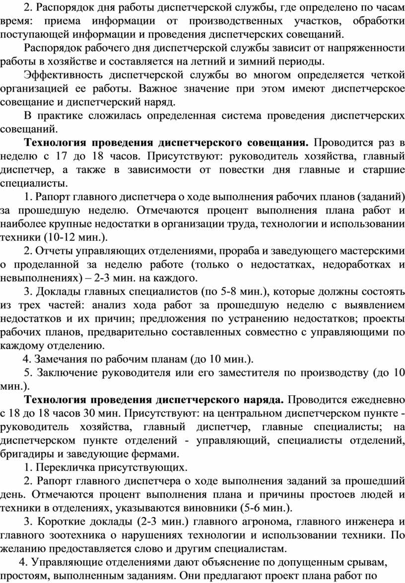 Распорядок рабочего дня диспетчерской службы зависит от напряженности работы в хозяйстве и составляется на летний и зимний периоды.