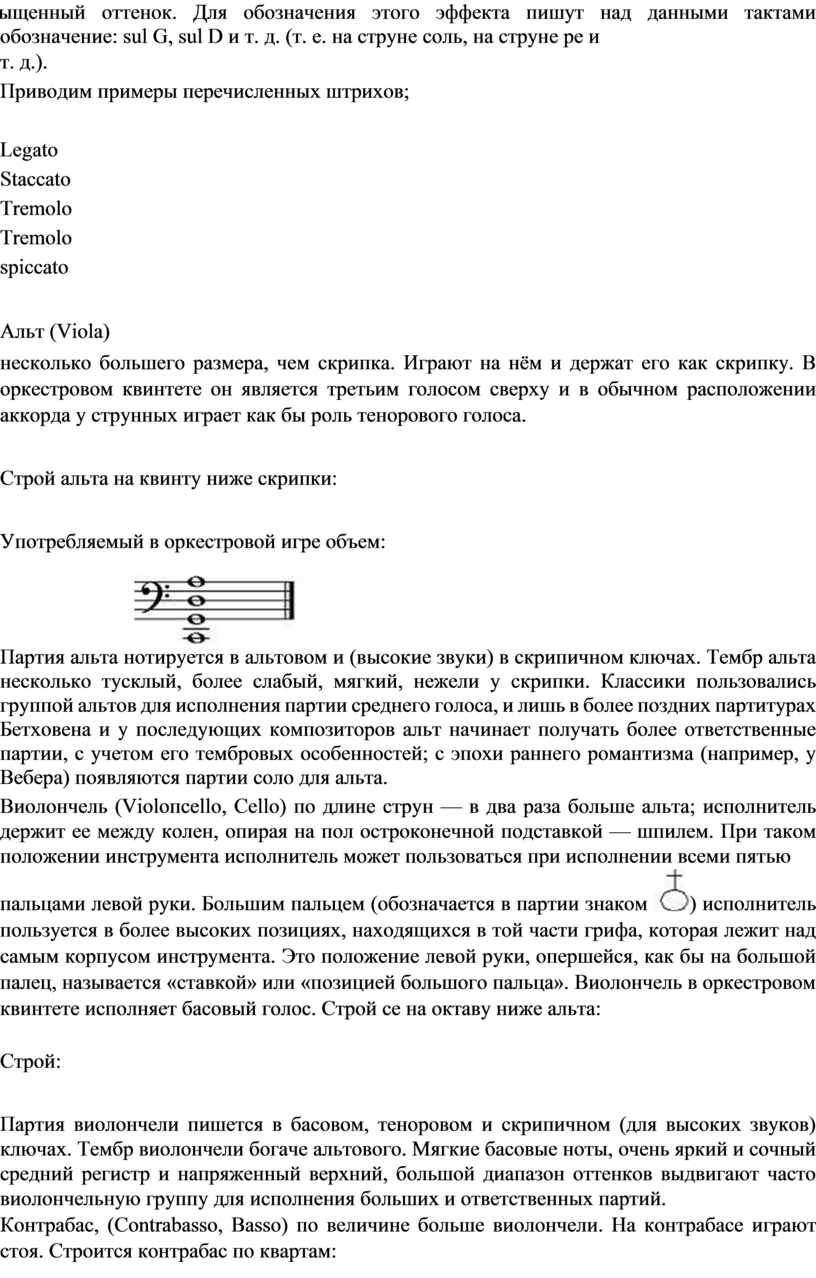 6.При игре на смычковых инструментах в мелодических последованиях переходят со струны на струну; но иногда для достижения особого эффекта исполнителю предписывают играть какое-либо последование на одной струне. Тембр таких звуков получает густой, насыщенный оттенок. Для обозначения этого эффекта пишут над данными тактами обозначение: sul G, sul D и т. д. (т. е. на струне соль, на струне ре и