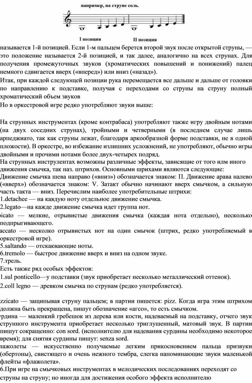 Одна и та же струна может давать звуки различной высоты, так как ее длину можно изменять нажатием пальцев. Струны, не прижатые пальцами, называются открытыми или (реже) пустыми и обозначаются знаком «О». На скрипке при-меняют семь основных и несколько дополнительных позиций. Позицией называется положение левой руки на скрипке в