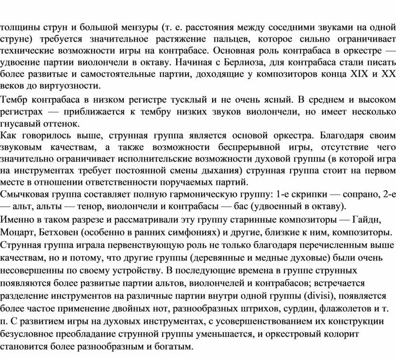 толщины струн и большой мензуры (т. е. расстояния между соседними звуками на одной струне) требуется значительное растяжение пальцев, которое сильно ограничивает технические возможности игры на контрабасе. Основная роль контрабаса в оркестре — удвоение партии виолончели в октаву. Начиная с Берлиоза, для контрабаса стали писать более развитые и самостоятельные партии, доходящие у композиторов конца XIX и XX веков до виртуозности.