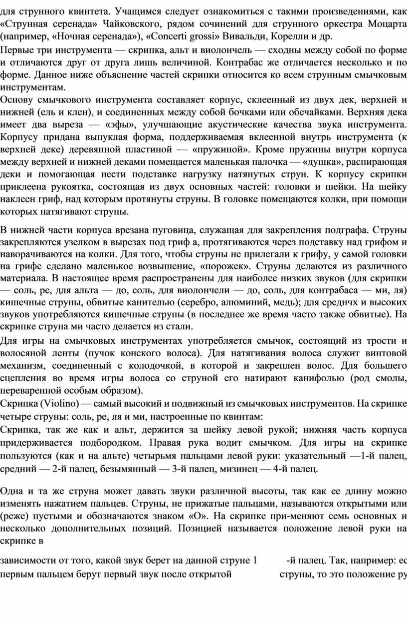 Группа смычковых инструментов является наиболее подвижной из всех оркестровых групп, так наз. «квинтет» или «квартет». Большое разнообразие в оттенках, богатство красок и в то же время исключительная ровность звучности на всем протяжении звукового диапазона этой группы выдвинули смычковые инструменты на первое место в симфоническом оркестре. Большие возможности, представляемые струнной группой, уже давно привлекали внимание композиторов, и в эпоху расцвета игры на смычковых инструментах, сольной и ансамблевой, в эпоху Корелли (1653—1713), Марчелло (1686—1739), Вивальди (1686—1743), Баха (1685—1750), Генделя (1685—1759) и др., создается обширная литература для одного струнного смычкового оркестра, представляющая и в наше время огромную художественную ценность. В последующие времена ряд выдающихся композиторов продолжает обогащать оркестровую литературу сочинениями для струнного квинтета. Учащимся следует ознакомиться с такими произведениями, как «Струнная серенада» Чайковского, рядом сочинений для струнного оркестра Моцарта (например, «Ночная серенада»), «Concerti grossi» Вивальди, Корелли и др.