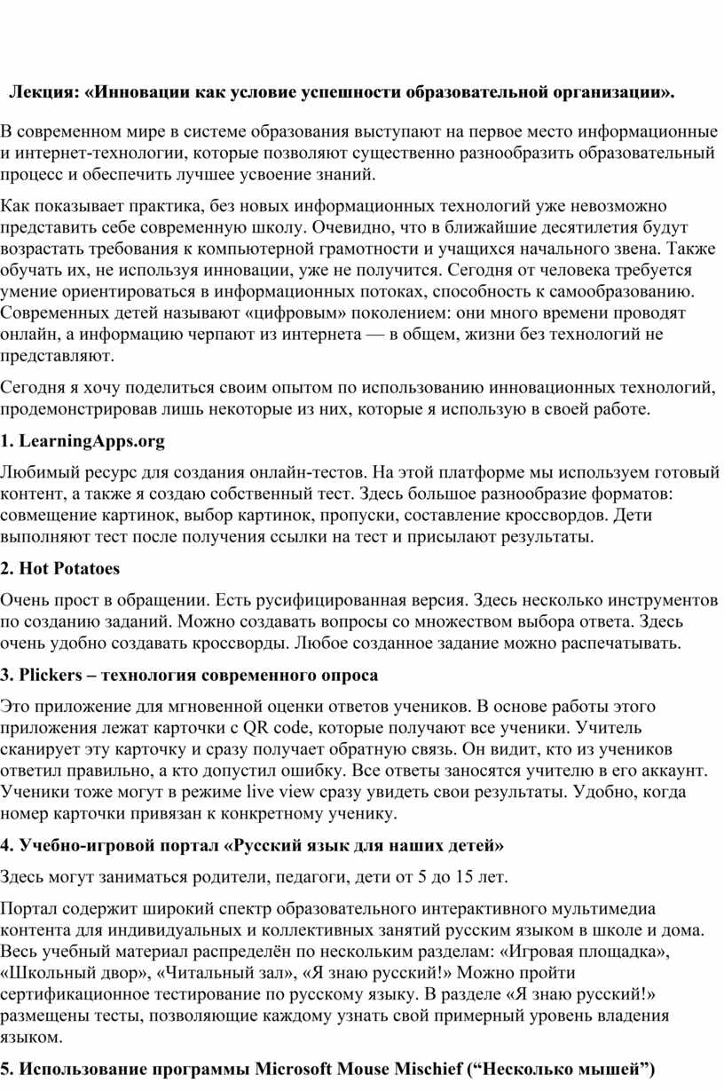 Лекция: «Инновации как условие успешности образовательной организации».