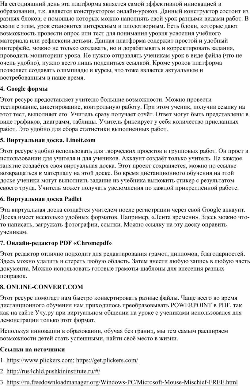 На сегодняшний день эта платформа является самой эффективной инновацией в образовании, т.к. является конструктором онлайн-уроков. Данный конструктор состоит из разных блоков, с помощью которых можно наполнять свой урок разными видами работ. В связи с этим, урок становится интересным и плодотворным. Есть блоки, которые дают возможность провести опрос или тест для понимания уровня усвоения учебного материала или рефлексии детьми. Данная платформа содержит простой и удобный интерфейс, можно не только создавать, но и дорабатывать и корректировать задания, проводить мониторинг урока. Не нужно отправлять ученикам урок в виде файла (что не очень удобно), нужно всего лишь поделиться ссылкой. Кроме уроков платформа позволяет создавать олимпиады и курсы, что тоже является актуальным и востребованным в наше время.