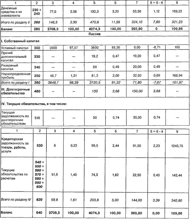 — относительная величина структуры (графа 4 и графа 6), показывающая, какова доля той или иной статьи актива (пассива) в имуществе предприятия (валюте баланса);
