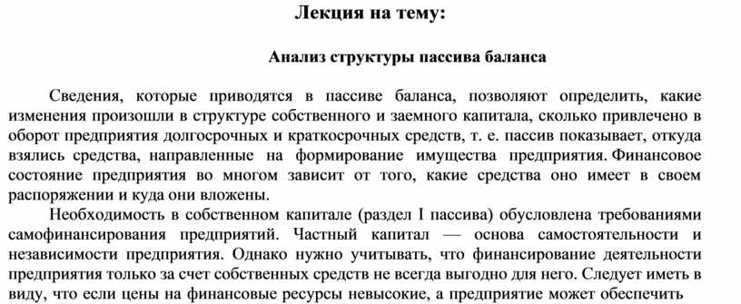 Сведения, которые приводятся в пассиве баланса, позволяют определить, какие изменения произошли в структуре собственного и заемного капитала, сколько привлечено в оборот предприятия долгосрочных и краткосрочных средств, т. е. пассив показывает, откуда взялись  средства,  направленные   на   формирование   имущества   предприятия. Финансовое состояние предприятия во многом зависит от того, какие средства оно имеет в своем распоряжении и куда они вложены.