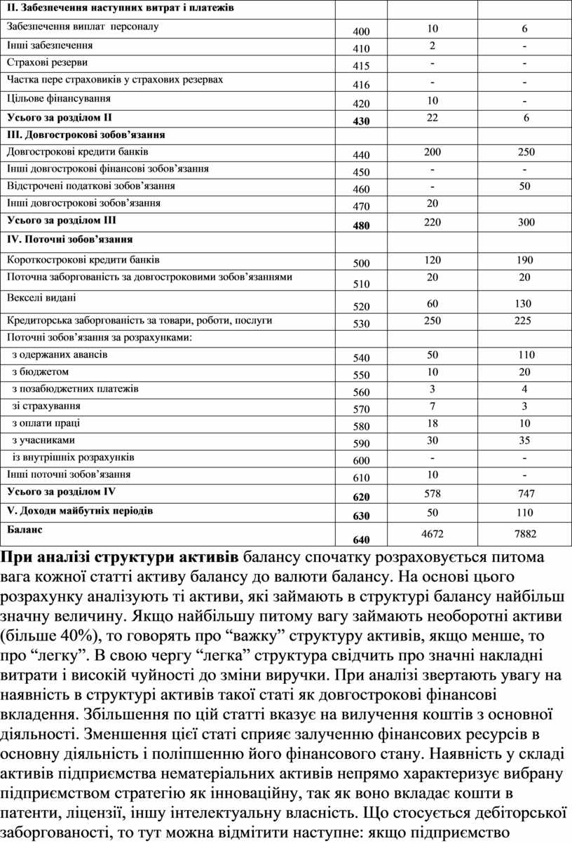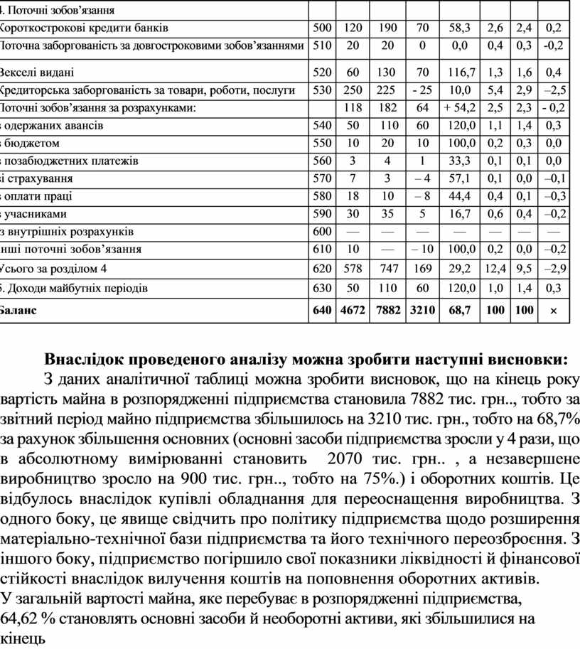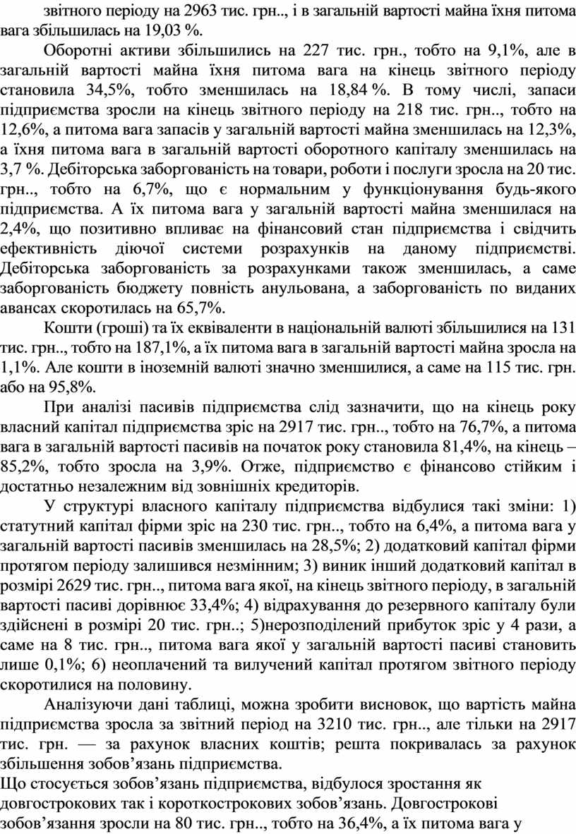 Аналізуючи дані таблиці, можна зробити висновок, що вартість майна підприємства зросла за звітний період на 3210 тис. грн.., але тільки на 2917 тис. грн. — за рахунок власних коштів; решта покривалась за рахунок збільшення зобов’язань підприємства.