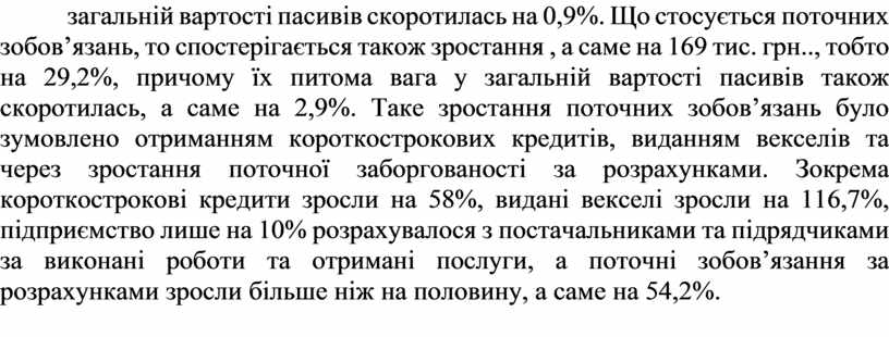 Що стосується зобов’язань підприємства, відбулося зростання як довгострокових так і короткострокових зобов’язань. Довгострокові зобов’язання зросли на 80 тис. грн.., тобто на 36,4%, а їх питома вага у загальній вартості пасивів скоротилась на 0,9%. Що стосується поточних зобов’язань, то спостерігається також зростання , а саме на 169 тис. грн.., тобто на 29,2%, причому їх питома вага у загальній вартості пасивів також скоротилась, а саме на 2,9%. Таке зростання поточних зобов’язань було зумовлено отриманням короткострокових кредитів, виданням векселів та через зростання поточної заборгованості за розрахунками. Зокрема короткострокові кредити зросли на 58%, видані векселі зросли на 116,7%, підприємство лише на 10% розрахувалося з постачальниками та підрядчиками за виконані роботи та отримані послуги, а поточні зобов’язання за розрахунками зросли більше ніж на половину, а саме на 54,2%.