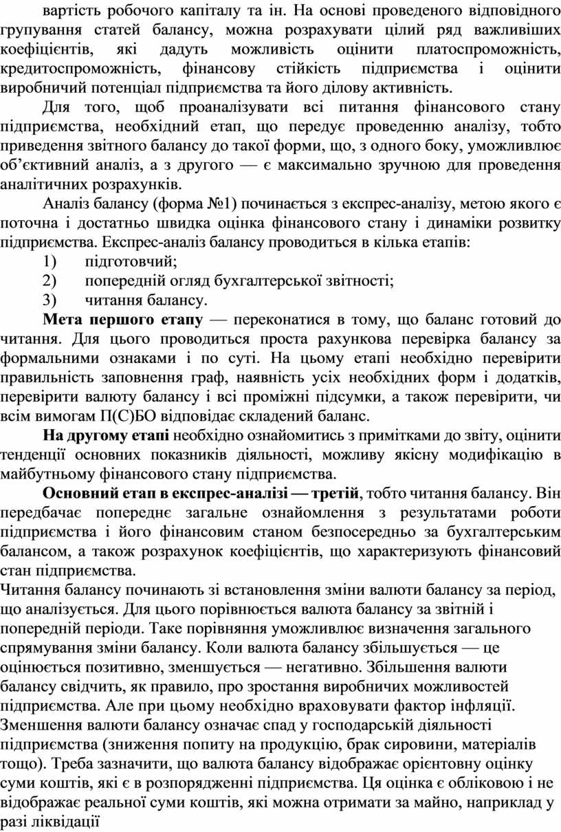 Аналіз фінансового стану підприємств здійснюється в основному за даними квартальної і річної звітності і в першу чергу за даними балансу. Баланс дозволяє зробити оцінку найсуттєвіших ознак фірми. Саму процедуру оцінок прийнято називати читанням балансу. Вміння читати баланс – важлива професійна характеристика фінансиста, яка надає йому можливість складати прогнозні баланси й управляти найважливішими фінансовими параметрами фірми. До того ж, вміння читати фінансові звіти допомагає фінансовому аналітику скласти правильну думку про фінансовий стан і виробничу діяльність інших компаній. При читанні балансу виясняють: характер зміни підсумку балансу та його окремих розділів і статей, правильність розміщення коштів підприємства, його поточну платоспроможність та ін.