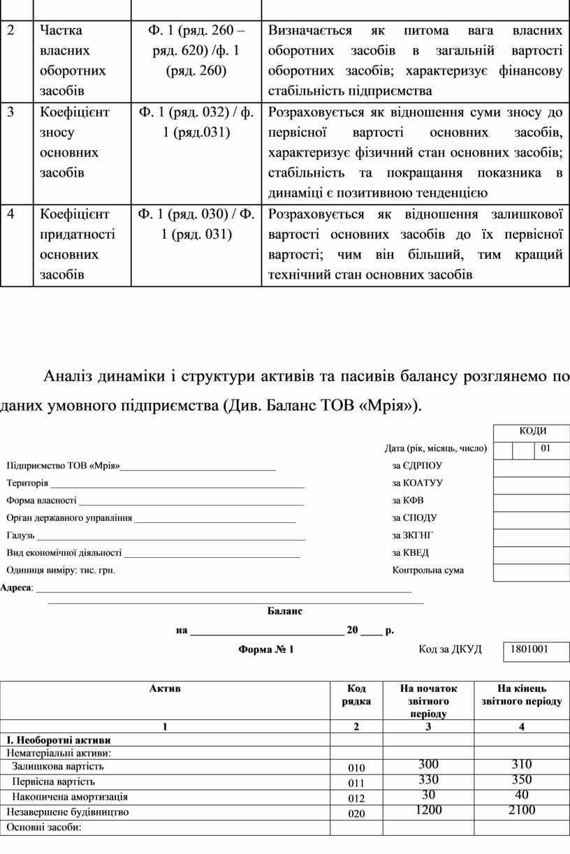 Аналіз динаміки і структури активів та пасивів балансу розглянемо по даних умовного підприємства (Див. Баланс ТОВ «Мрія»).