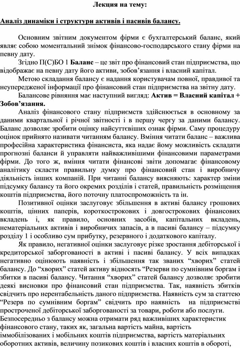 Аналіз динаміки і структури активів і пасивів балансу.