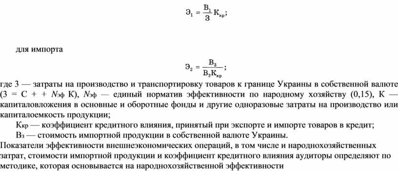 Показатели эффективности внешнеэкономических операций, в том числе и народнохозяйственных затрат, стоимости импортной продукции и коэффициент кредитного влияния аудиторы определяют по методике, которая основывается на народнохозяйственной эффективности